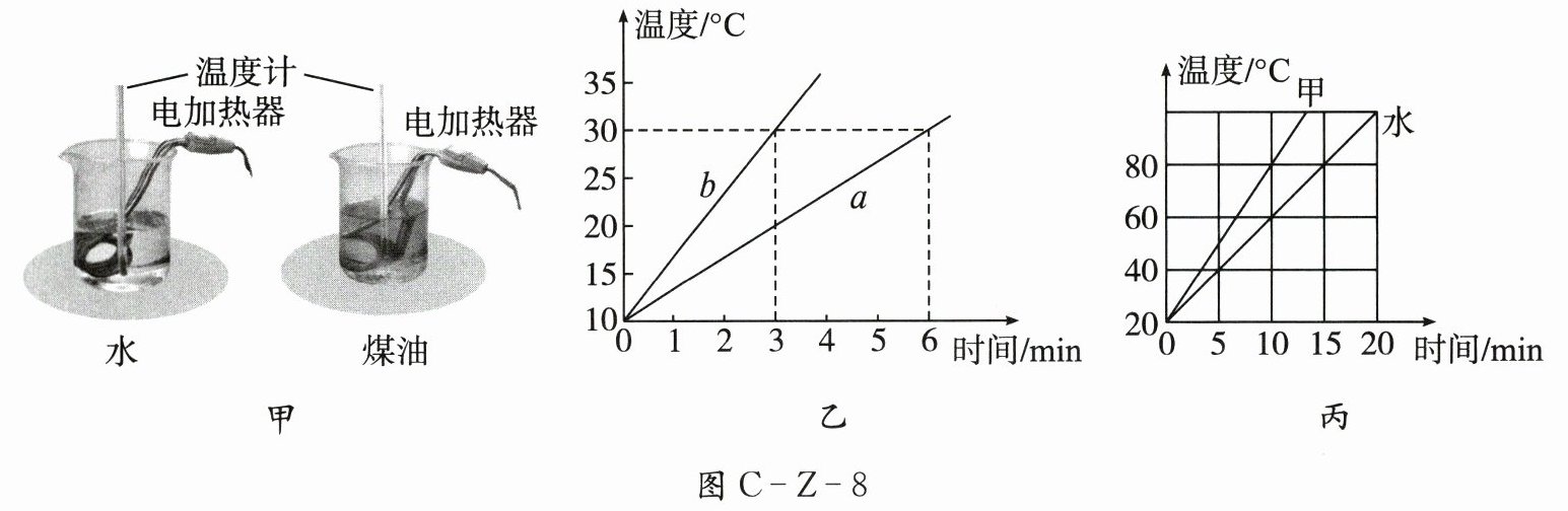 (4)如果用两个同样的电加热器分别给质量均为$1\ {kg}$的液体甲和水加热,它们的温度随时间变化的关系图像如图C-Z-8丙所示,据此可判断出液体甲的比热容为______${J/(kg\cdot^{\circ}C)}$。[$c_{水}= 4.2× 10^{3}\ {J/(kg\cdot^{\circ}C)}$]