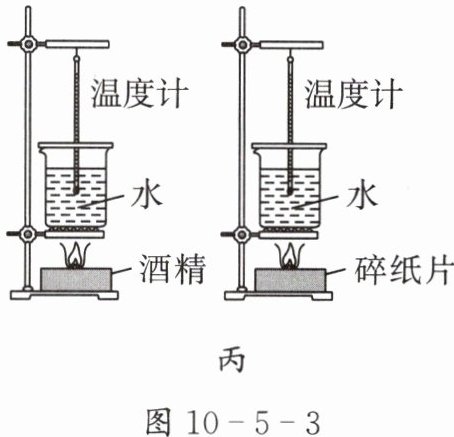 (2)如图10 - 5 - 3丙所示,为了比较酒精和碎纸片的热值,可用两个相同的烧杯装质量相同的水,取质量____(选填“相同”或“不同”)的酒精和碎纸片,分别放入两个燃烧皿中,点燃给烧杯加热直到酒精和碎纸片完全燃烧。通过比较____(选填“加热时间的长短”或“温度计示数升高的多少”)来比较酒精和碎纸片热值的大小。