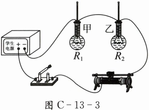 6. 图C-13-3是“探究影响电流热效应的因素”的实验装置,将$R_1、$$R_2$两电阻丝密封在两个完全相同的烧瓶内,且$R_1>R_2,$两瓶内装着等质量的煤油。下列说法错误的是( )。