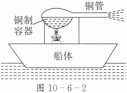 1. 兴趣小组制作的“蒸汽船”模型如图 10 - 6 - 2 所示。将盛有适量水的铜制容器安装在“船体”上,并用酒精灯对其底部进行加热,一段时间后铜质容器内的水温升高产生蒸汽,并通过铜管向右喷出,“蒸汽船”就会向左行驶。下列说法正确的是( )。