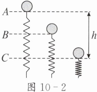 2. 如图 10 - 2 所示,用手将一重为 G 的铁球缓慢放在一弹簧上,放手后,铁球从 A 位置开始向下运动,到达 B 位置时速度达到最大,到达 C 位置时速度变为零。已知 A、C 间的高度差为 h,若整个过程中不计能量损耗,下列说法正确的是( )。