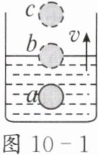 1. 如图 10 - 1 所示,将小球压入水中,在 a 处将其由静止释放,小球始终沿直线向上运动,跃出水面后最高可达空中的 c 处,小球在 b 处受到的合力为零。下列说法正确的是( )。