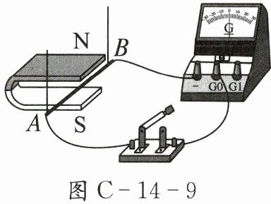 14. (10分)在“探究导体在磁场中运动时产生感应电流的条件”实验中,用绝缘细线将一根导体棒AB悬挂在蹄形磁体的磁场中,再将导体棒AB、灵敏电流计及开关用导线连成一个电路(如图C-14-9所示)。