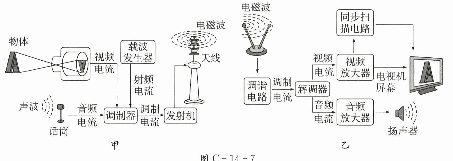 12. (4分)电视信号的发射和接收过程如图C-14-7所示。图C-14-7乙中电视机屏幕的作用是将接收的图像电信号还原成____,扬声器的作用是将音频电信号转换成____。
