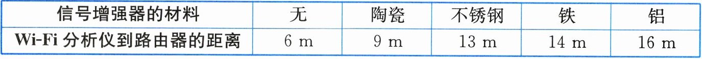 (1)为了验证猜想一,小华进行了如下实验:“黑管”发出稳定信号后,将不同材料的信号增强器凹面朝向Wi-Fi分析仪,同时直线移动Wi-Fi分析仪直到接收到的信号强度为50dB,测出Wi-Fi分析仪到路由器的距离,记录的数据如下表所示。