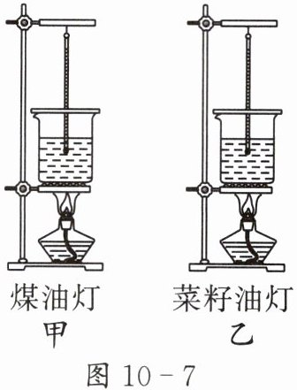 3. 小明学习了燃料的热值知识后,设计了一个实验来比较煤油和菜籽油的热值大小。他组装的实验装置如图 10 - 7 所示,用装有相同质量的煤油和菜籽油的两盏灯分别给两杯初温和质量相同的水加热。