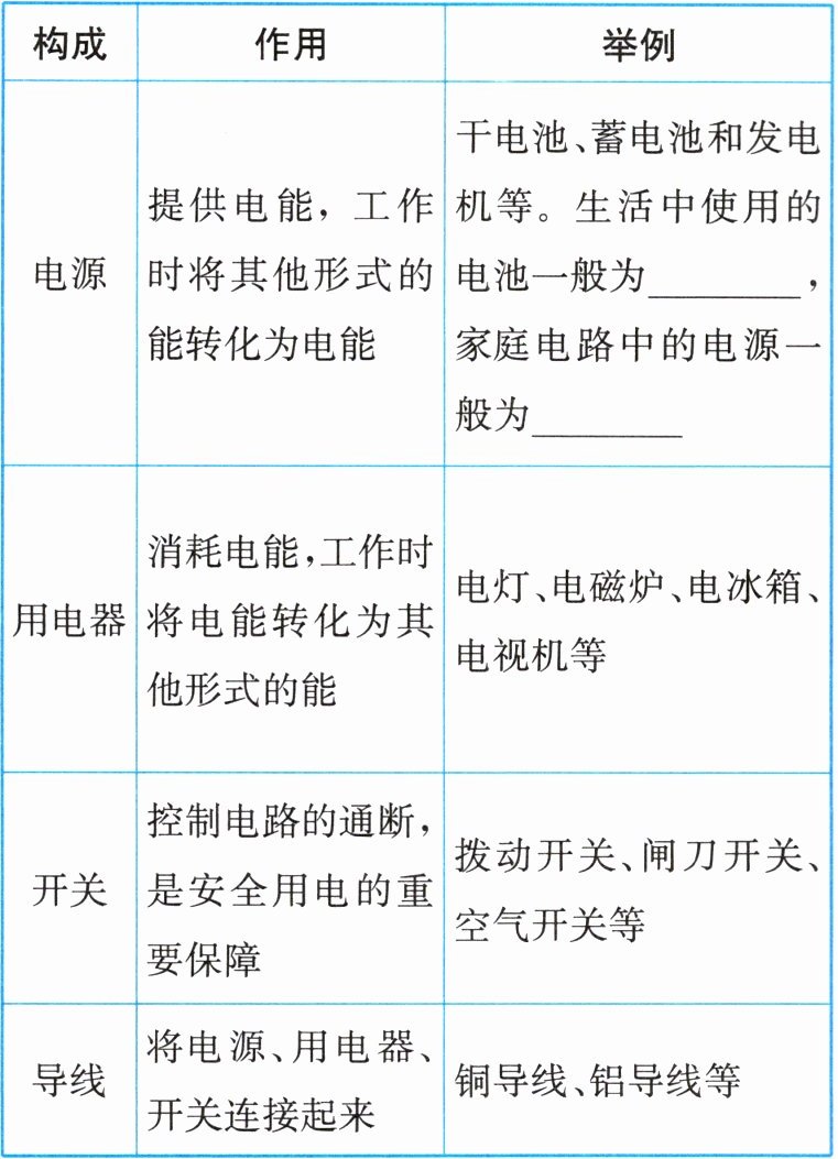 |电源|提供电能,工作时将其他形式的能转化为电能|干电池、蓄电池和发电机等。生活中使用的电池一般为______,家庭电路中的电源一般为______|