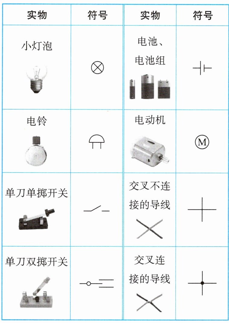 小灯泡:○×;电池、电池组:|—|;电铃:∩;电动机:M;单刀单掷开关:—┐—;交叉不连接的导线:+;单刀双掷开关:—○—┬—;交叉连接的导线:⊕