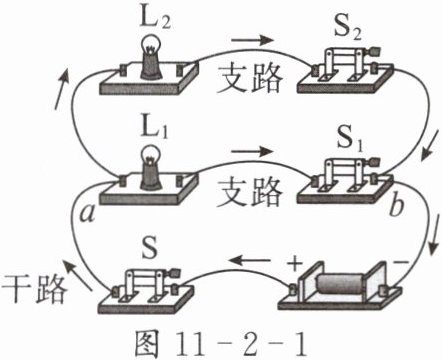 如图 11 - 2 - 1 所示,在并联电路中,a、b 两点叫作电路的分支点,电源两极到两个分支点的电路是____,两个分支点间的各条电路是____。