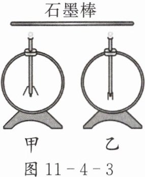 1. 在干燥环境中,取两个相同且不带电的验电器甲和乙,用毛皮摩擦过的橡胶棒接触甲的金属球,甲的两金属箔张开。再用石墨棒连接甲、乙验电器的金属球,如图11-4-3所示,观察到乙的两金属箔张开。下列说法正确的是( )。