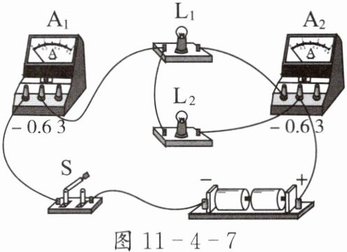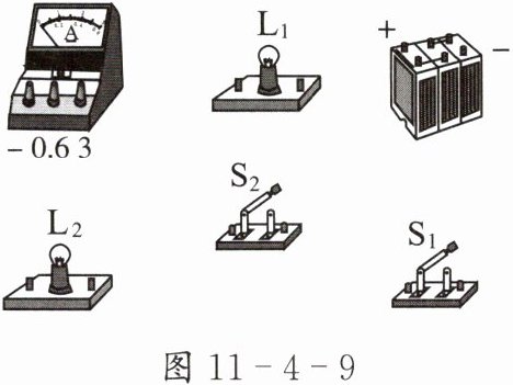 3. 请用笔画线表示导线连接图11-4-9中的实物。要求:开关$S_1$同时控制两盏灯,开关$S_2$只控制灯$L_2,$电流表测量通过灯$L_1$的电流(电流大小约为0.3 A),导线不能交叉。