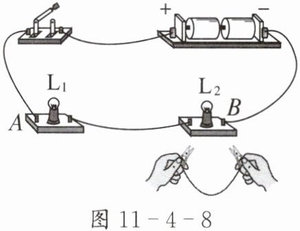 2. 两个规格不同的小灯泡单独接在两节干电池组成的电源两端都能发光。把其连接成如图11-4-8所示的电路,闭合开关后,小灯泡$L_1$和$L_2$也都发光,但亮度要暗一些,下列说法正确的是( )。