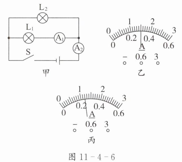 5. 如图11-4-6甲所示,当开关S闭合后,电流表$A_1、$$A_2$的指针位置分别如图11-4-6乙、丙所示,其中电流表$A_1$测量的是通过_________(选填“干路$”“L_1”$或$“L_2”)$的电流,电流表$A_2$的示数为_________ A。