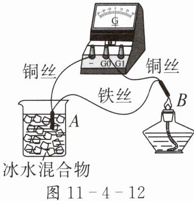 用两种不同材料的导体(如铁丝和铜丝)组成如图11-4-12所示的闭合电路,当A、B两端存在温度差时,电路中就会有电流通过,这就是塞贝克效应(又叫热电效应),这种电路叫热电偶电路。