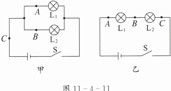 (3) 另一实验小组的同学用图11-4-11乙中的电路探究“串联电路的电流规律”,闭合开关S后,发现$L_1$比$L_2$亮,则通过$L_1$的电流$I_1$_________(选填“大于”“小于”或“等于”)通过$L_2$的电流$I_2。$