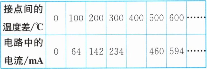 (3) 结合表中的数据规律推算:当接点间的温度差为400°C时,电路中的电流为______。