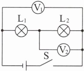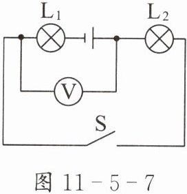 3. 如图 11 - 5 - 7 所示,电源电压为$6V$。若开关$S$闭合,电压表的示数为$4V$,则$L_{2}$两端的电压是____$V$;若开关$S$断开,则电压表____(选填“有”或“无”)示数。