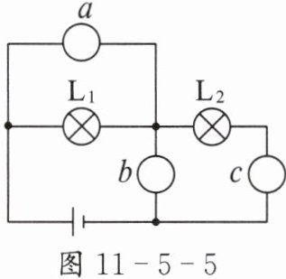 1. 如图 11 - 5 - 5 所示,在“〇”处可以连接电流表或电压表测量电路中的电流或电压。为使$L_{1}与L_{2}$串联,下列做法正确的是( )。