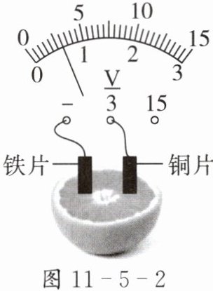 3. 勤思考、爱动手的小果取半个橙子,把铜片、铁片插入其中,就制成了水果电池。用电压表测量水果电池的电压,示数如图 11 - 5 - 2 所示。下列说法正确的是( )。