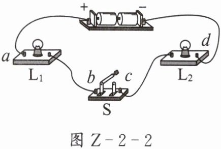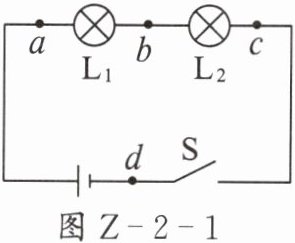 1. 如图 Z-2-1 所示,开关闭合后,两灯都不亮。用一根导线连接 a、b 两点后,两灯仍不亮,再用这根导线连接 b、c 两点后,两灯还是不亮;仍然用这根导线连接 b、d 两点后,灯$ L_1$亮而灯$ L_2$不亮。假设故障是下列选项中的一个,那么故障可能是( )。