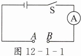 4. 如图 12 - 1 - 1 所示,把$ R_1$接入 A、B 之间,闭合开关 S 后,电流表的示数为 2 A;把$ R_2$接入 A、B 之间,闭合开关 S 后,电流表的示数为 1 A,则$ R_1$_________(选填“>”“<”或$“=”)R_2。$断开开关 S 后,电流表的示数变为$ 0,R_2$的电阻大小_________(选填“改变”或“不变”)。