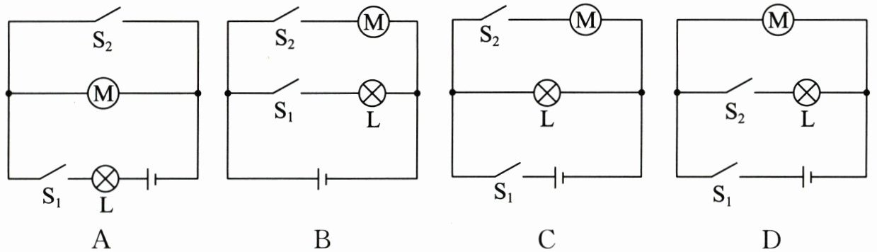 4. 骑电动自行车不戴头盔存在安全隐患,于是小明设计了以下方案:骑行前,扫码成功后开关$ S_1 $闭合,指示灯 L 亮,但电动机不工作;戴上头盔后开关$ S_2 $闭合,电动机通电工作;若只戴头盔不扫码,则无法骑行。图 C - 11 - 3 中的电路设计符合要求的是( )。