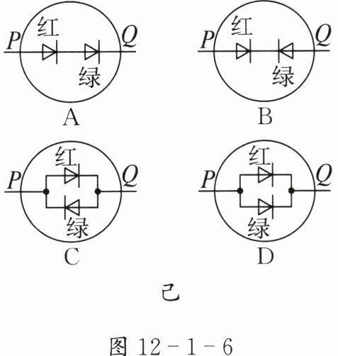 (4)小刚用一个变光二极管再进一步做实验,通过实验发现:电流从其 P 端流入时发红光,从其 Q 端流入时发绿光,则该变光二极管的内部结构可能是图 12 - 1 - 6 己中的______(填选项字母)。
