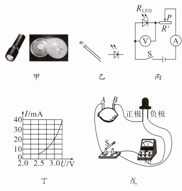 二极管具有单向导电性,使用时将它的正极与电源正极相连,二极管才能处于导通状态。如图 12 - 1 - 6 丙所示,将 LED 接入电源电压恒为 4.5 V 的电路,闭合开关 S,调节 R'可以改变 LED 两端的电压和电路中的电流,可以得到电流表与电压表的示数关系,如图 12 - 1 - 6 丁所示。