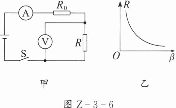 6. 图 Z-3-6 甲为某科技小组设计的汽车有害尾气排放检测电路,电源电压恒定,R₀为定值电阻,R 为气敏电阻,其阻值随其所在处有害尾气浓度 β 变化的关系图像如图 Z-3-6 乙所示。闭合开关 S,当电压表的示数低于某个值 U 时会触发报警电路(图中未画出)。下列说法正确的是( )。