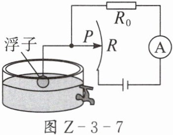 7. 如图 Z-3-7 所示,这是一种测定油箱内油量的装置,其中 R 是滑动变阻器的电阻片,R₀为定值电阻。当油量减少时,滑动变阻器的滑动头 P 向上移动,则电路中的( )。