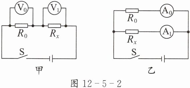 2. 用电流表和已知阻值的定值电阻$R_{0}测未知电阻R_{x}$的阻值。设计的电路图如图 12 - 5 - 2 乙所示。测得通过$R_{0}的电流为I_{0}$,通过$R_{x}的电流为I_{x}$,则$R_{x}= $____。