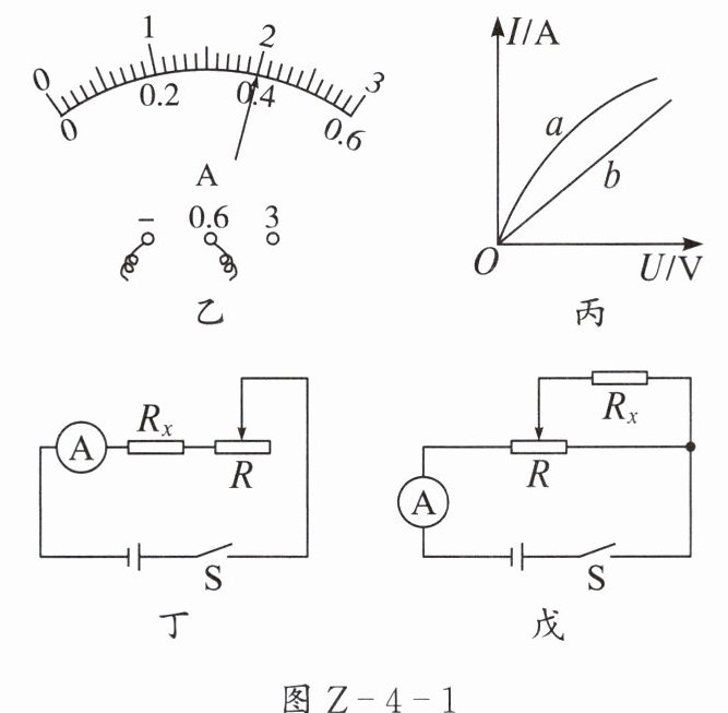 (4) 把图 Z-4-1 甲中的未知电阻换成小灯泡,测量小灯泡的电阻。根据两次实验的数据绘制出 $ I - U $ 图像,如图 Z-4-1 丙所示,其中小灯泡的 $ I - U $ 图线是______(选填“$ a $”或“$ b $”),理由是______。
