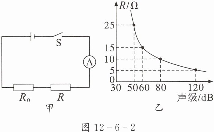 2. 噪声污染是当今社会四大污染之一,长期处于噪声环境中会影响身心健康。为了监测周围环境声音的强弱(即声级),同学们找来定值电阻 $ R_0 $、声敏电阻 $ R $(其阻值会随声级的变化而变化)、电流表、学生电源等器材,设计了可用电流表的示数来反映声级的装置,如图 12 - 6 - 2 甲所示,其中 $ R $ 的阻值随声级变化的关系图像如图 12 - 6 - 2 乙所示,电源电压为 $ 6 $ V 且保持不变。在某次测试中,当声级为 $ 50 $ dB 时,电流表的示数为 $ 0.2 $ A。闭合开关 $ S $,下列说法正确的是( )。