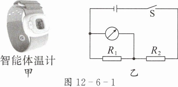 1. 小军受穿戴式“智能体温计”(如图 12 - 6 - 1 甲所示)的启发,设计了如图 12 - 6 - 1 乙所示的体温计电路图,用电表的示数大小反映温度的高低,热敏电阻 $ R_1 $ 的阻值随温度的升高而增大,定值电阻 $ R_2 $ 起保护电路的作用。下列分析正确的是( )。