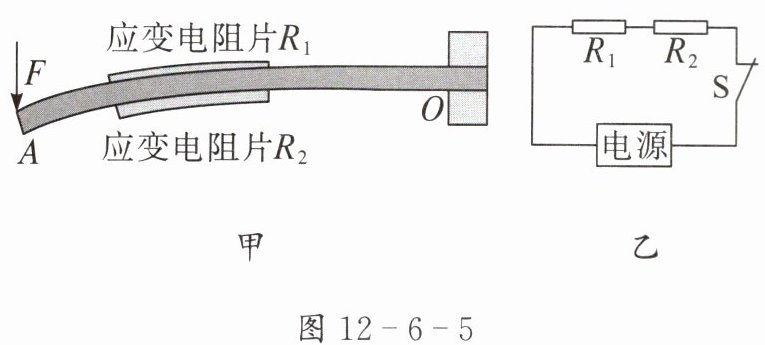 1. 图 12 - 6 - 5 甲是一种测力装置部分结构的示意图,横梁 $ OA $ 上、下表面各贴一张完全一样的应变电阻片 $ R_1 $、$ R_2 $,$ R_1 $ 和 $ R_2 $ 串联在电流恒定的电路中(如图 12 - 6 - 5 乙所示)。应变电阻片被拉伸或压缩时会导致自身长度及横截面积发生变化,其阻值会发生变化。当在横梁 $ OA $ 的 $ A $ 端施加向下的力 $ F $ 时,横梁 $ OA $ 向下弯曲,$ R_1 $ 被拉伸,$ R_2 $ 被压缩,下列说法正确的是( )。