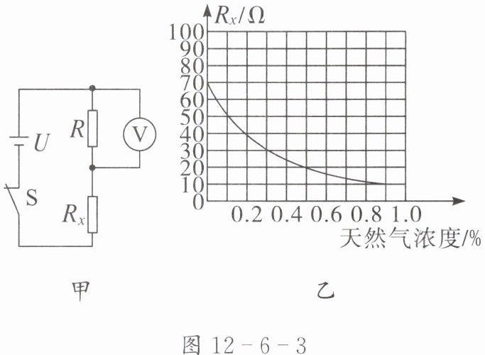 3. 图 12 - 6 - 3 甲是小华设计的天然气浓度测试仪,电源电压 $ U $ 恒为 $ 4 $ V,$ R $ 为定值电阻,电压表的量程为 $ 0 \sim 3 $ V(将电压表作为天然气浓度的显示装置),气敏电阻 $ R_x $ 的阻值与天然气浓度的关系图像如图 12 - 6 - 3 乙所示。当天然气浓度增加时,$ R_x $ 的阻值会______,电压表的示数会______(以上两空均选填“增大”或“减小”)。要求将电压表表盘上的 $ 1.5 $ V 处标为天然气浓度 $ 0.5\% $,电阻 $ R $ 的阻值应为______ Ω。