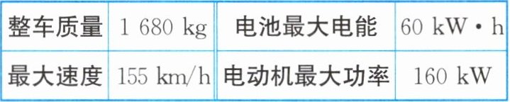 |整车质量|$1680kg$|电池最大电能|$60kW\cdot h$|