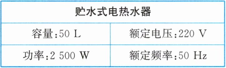 (1)该电热水器贮水的质量$m_{水}=\rho_{水}V_{水}=1.0×10^{3}\ kg/m^{3}×50×10^{-3}\ m^{3}=50\ kg$。