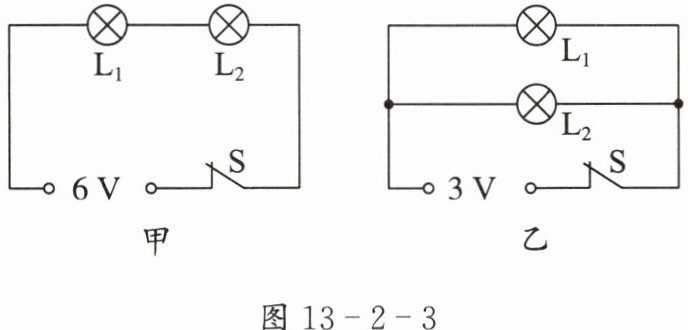 2. 现有两个小灯泡$L_{1}$、$L_{2}$,它们的额定电压分别是$3V$、$6V$,忽略温度对灯丝电阻的影响。将它们串联后接到电压为$6V$的电源两端,如图$13 - 2 - 3$甲所示,它们的实际功率相同。若将它们并联后接到电压为$3V$的电源两端,如图$13 - 2 - 3$乙所示,下列说法正确的是( )。