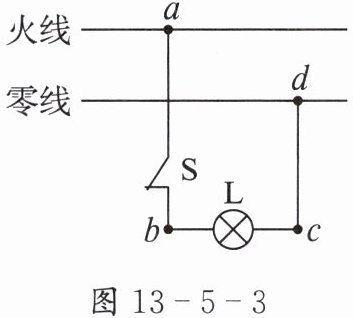 2. 如图 13 - 5 - 3 所示,闭合开关 $S$,灯泡 $L$ 突然熄灭。用试电笔分别测试电路中的 $a$、$b$、$c$、$d$ 四点,只有测 $d$ 点时氖管不发光。若电路中只有一处故障,则故障可能是( )。