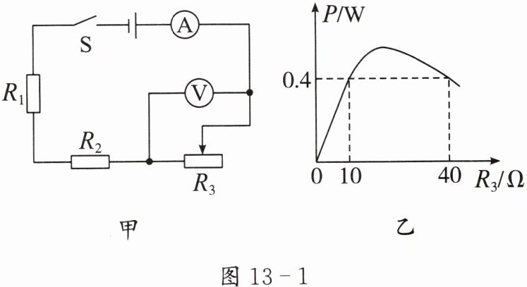 1. 如图 13 - 1 甲所示,电源电压恒定,$R_1$、$R_2为定值电阻且R_2 = 10\ \Omega$,滑动变阻器$R_3$接入电路的阻值变化范围为 $0 \sim 50\ \Omega$。闭合开关 $S$,滑动变阻器的滑动头从一端移到另一端的过程中,滑动变阻器的电功率随其接入电路的电阻变化的关系图像如图 13 - 1 乙所示。下列说法正确的是( )。
