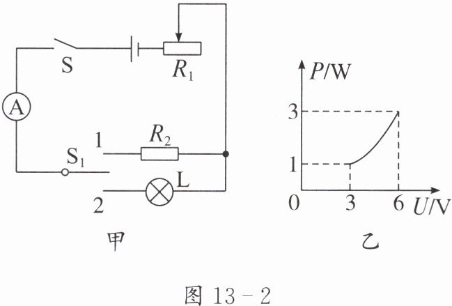 2. 如图 13 - 2 甲所示,电源电压恒为 $9\ V$,小灯泡 $L$ 上标有“$6\ V\ \ 3\ W$”的字样,定值电阻 $R_2 = 10\ \Omega$,电流表的量程为 $0 \sim 0.6\ A$,滑动变阻器 $R_1$ 的规格为“$20\ \Omega\ \ 1\ A$”。当 $S$ 闭合、$S_1$ 接 2 时,滑动变阻器 $R_1$ 的滑动头只在某两点间移动,小灯泡 $L$ 的电功率随其两端电压变化的关系图像如图 13 - 2 乙所示。下列说法正确的是( )。