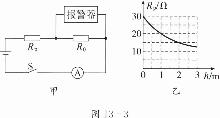 学校开展了防溺水安全教育活动后,物理兴趣小组设计了一种可以戴在手腕上的防溺水定位求救报警器,其简化电路如图 13 - 3 甲所示。已知电源电压为 $6\ V$;报警器由电压表改装而成;$R_0$ 是定值电阻,其阻值为 $10\ \Omega$;$R_p$ 是压敏电阻,其阻值 $R_p$ 随水深 $h$ 变化的关系图像如图 13 - 3 乙所示。报警器浸入水中的深度 $h$ 大于等于 $1\ m$ 时,报警器报警。