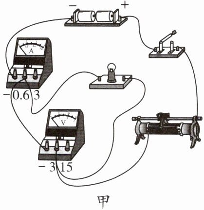 甲图:实物电路图,有电源(两节干电池)、开关、电流表(0 - 0.6 A 量程)、电压表(0 - 3 V 量程)、滑动变阻器、小灯泡。电流从电源正极流出,经开关、滑动变阻器、小灯泡、电流表回到电源负极。滑动变阻器接左上和右下接线柱,滑片向右移动电阻变大。电压表并联在小灯泡两端。