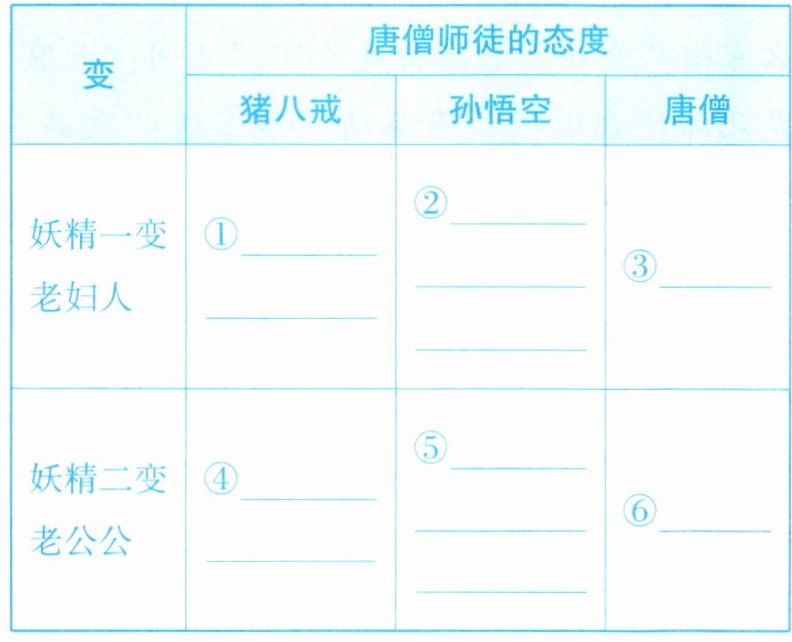 1. ①认为是寻亲 ②辨别、打死妖精 ③念咒 ④再次认为是寻亲 ⑤辨别、犹豫、打杀妖精 ⑥欢喜 2. 猪八戒:不加考证,盲目判定事实;爱搬弄是非。孙悟空:善于思考,对事实加以辨别;有情有义,面对师父的咒语、批评,仍不离不弃。唐僧:一心向善,却又不辨是非。 3. 孙悟空无法说服师父,就杜撰出一个《松箍儿咒》巧妙回应,反将一军,又用“跟你一场”这样的煽情话语,使师父无法拒绝,从而使师父放弃对他的驱逐。 4. ①“犹豫”呼应上文唐僧念咒的情节,表现紧箍咒带来的深刻影响。②“犹豫”之后的选择,更加凸显孙悟空保护师父、除恶扬善的坚定,丰富了人物形象。