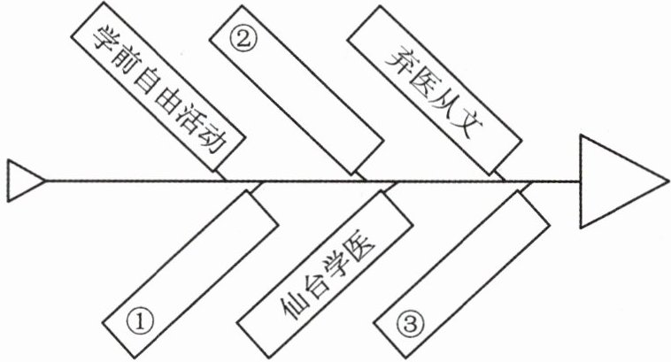 (1)①《琐记》 ②学医救国 (2)鲁迅幼时离家求学,后来不满于社会现状,离开故乡到南京求学,最终为救国远赴日本学医,从个人成长中的求学需要逐步发展为民族危亡之际的救国需要,鲁迅实现了由小我走向大我的成长。