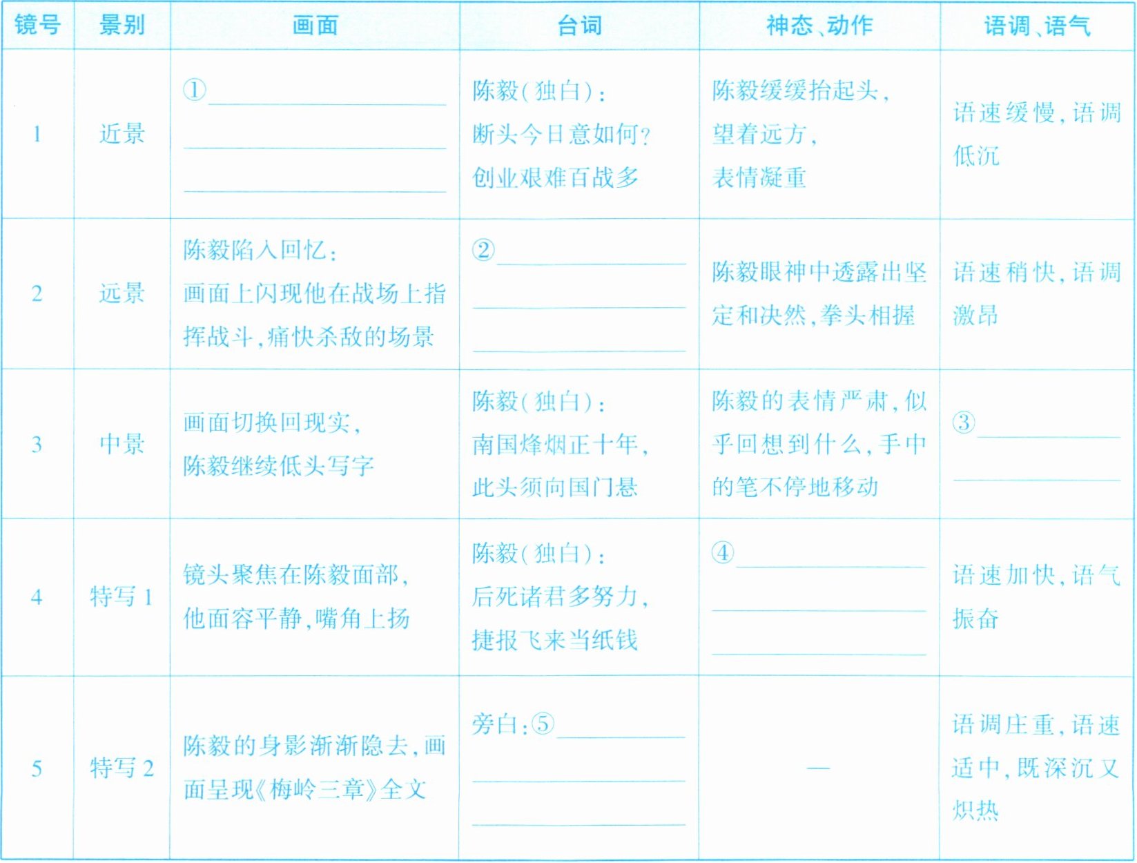 【任务一 示例】各位游客,大家好。1934年秋,陈毅负伤,留在赣粤边开展游击战,克服吃住行等困难,运用机动的战术,化解了敌人的"清剿"。1936年冬,他在梅山被围,生死关头,写诗藏在衣底作为绝笔,表达了对革命的忠诚和对未来的信心。1937年,全民族抗战爆发,"清剿"半途而废,陈毅脱险后补写小序,完成这组诗。 【任务二 示例】①陈毅坐在密林中的一棵树下,面前放着一张纸和一支笔。他面容憔悴,但眼神坚定 ②陈毅(独白):此去泉台招旧部,旌旗十万斩阎罗 ③语速、语调沉稳,语气豪迈 ④陈毅眼神刚毅,充满对未来胜利之景的展望 ⑤《梅岭三章》是陈毅同志被困时写的一组带有绝笔性质的诗。虽然处在危难之际,但他对革命事业的决心和对未来必胜的信心矢志不移。他的精神激励着一代又一代中华儿女为实现中华民族伟大复兴的中国梦勇往直前 【任务三 示例】我们要学好文化知识与本领技能,为建设伟大祖国贡献自己的一份力量;我们要传承革命先烈英勇无畏的革命精神,不忘初心,奋勇向前。(此为开放性题目,言之有理即可)