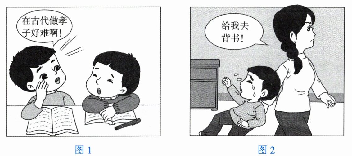 (1)【示例1】图1 《二十四孝图》 年过七十的老莱子身着彩衣假扮婴儿,取水诈跌,讨父母欢心。 这是一种虚伪的愚孝,不可取。 【示例2】图2 《五猖会》“我”想去看五猖会,父亲却要求“我”先把书背会再去。 无论过去还是现在,父母大都把学习看得很重,而忽略孩子的天性,这往往让我们难过失望。 (2)【示例】①对大自然和童年生活的喜爱 ②长妈妈给“我”买《山海经》(与长妈妈有关的其他情节,能体现“怀念”也可) ③《父亲的病》 ④对父亲的爱 ⑤弃医从文(寻求救国救民真理)
