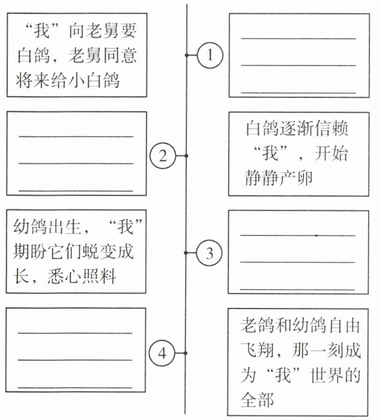 四、课文分四个阶段叙述“我”与两代白鸽的故事,请根据提示,梳理课文内容,把空格补充完整。