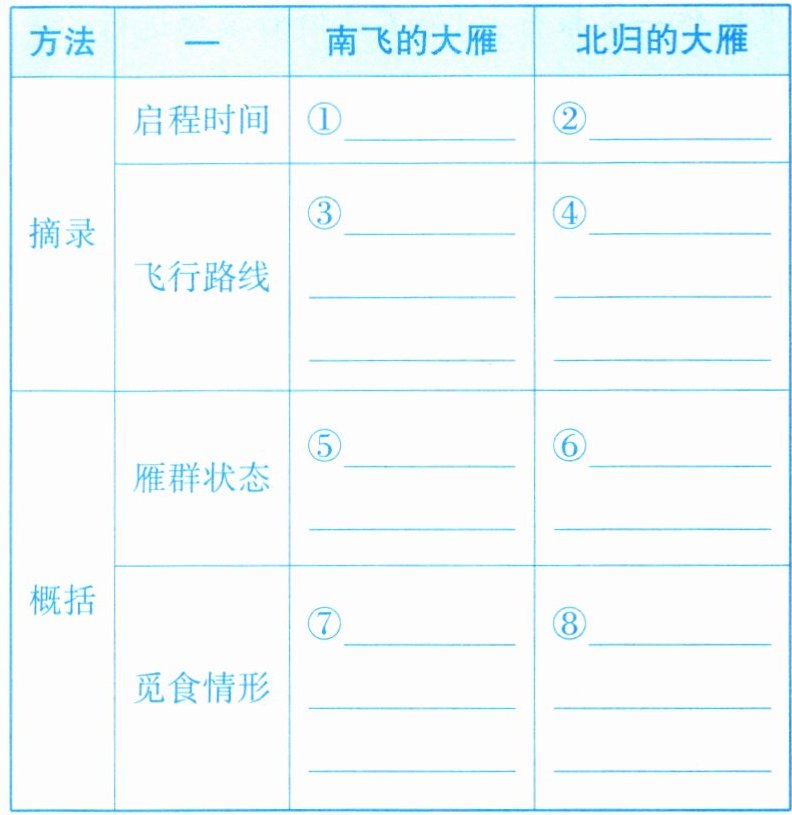 ①11月份 ②3月份 ③坚定不移地向南飞行20英里直达最近的大湖 ④顺着河流,穿过岬角和小岛,在沼泽和草地上空曲折穿行 ⑤全力以赴,无暇顾及其他 ⑥欢愉的,悠闲的,自由自在的 ⑦看准时机,跑到刚刚收割的玉米地里偷食玉米 ⑧不分早晚,成群结队地飞往收割后的玉米地享受食物